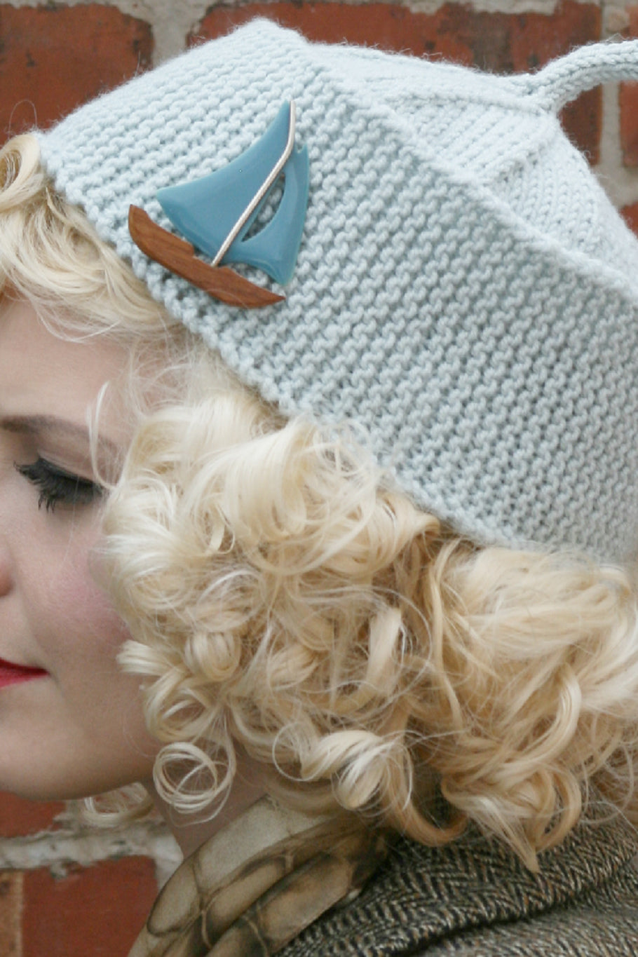 A one-off knitted sample from A Stitch in Time Volume 2 knitted with Rooster Merino yarn in a soft blue shade. This beautiful 1930s style hat sit neatly on the head in a similar way as does a beanie but with the deep border framing the body of the hat. (Does not include brooch).