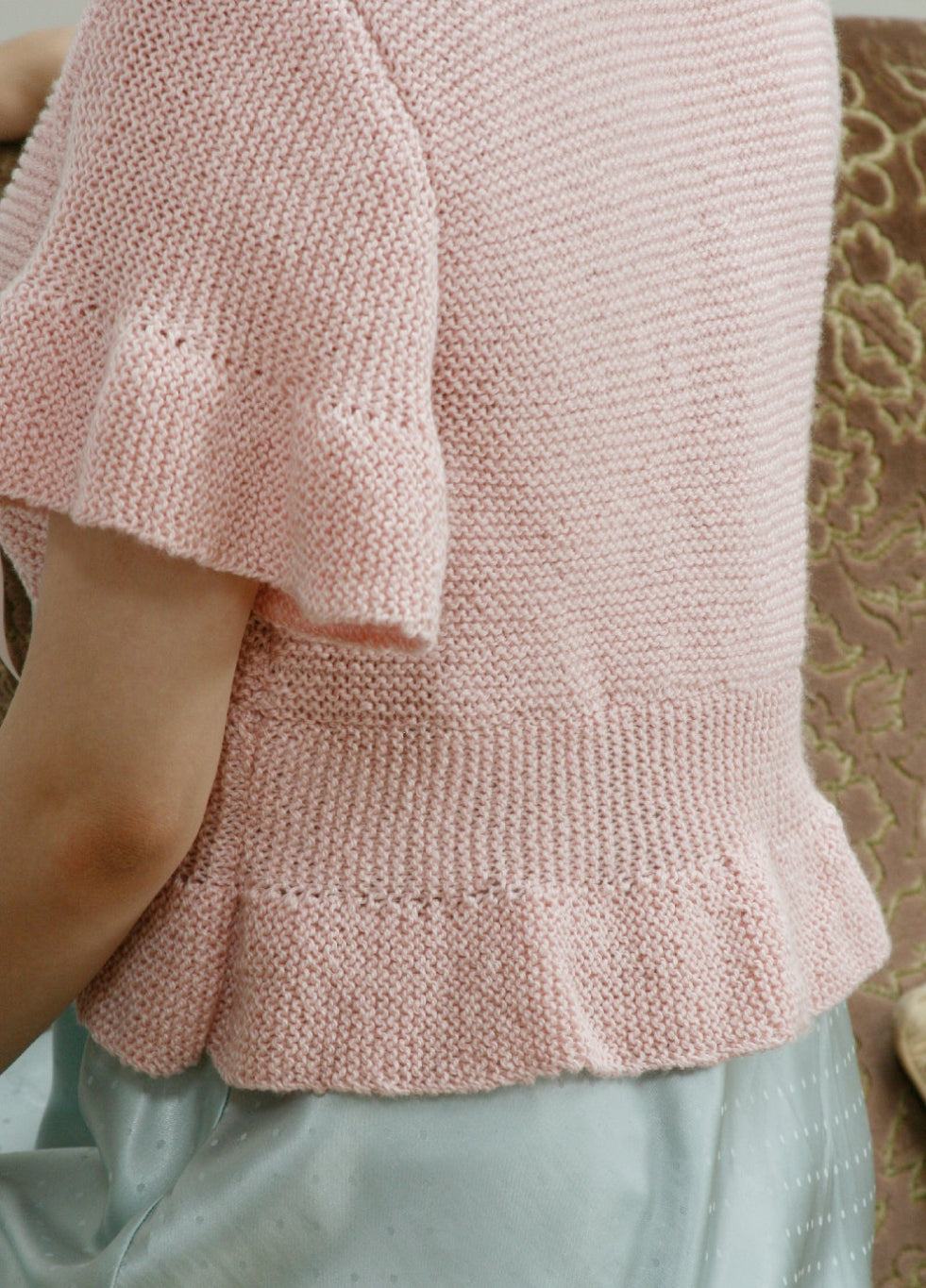 A one-off knitted sample from A Stitch in Time Volume 2 knitted with Fyberspates Scrumptious 4ply 45% silk, 55% superwash merino in the shade Baby Pink. This beautiful garment encapsulates the delicacy of the 1930s. The garment is finished with a white ribbon that will allow to slightly fit the shape.