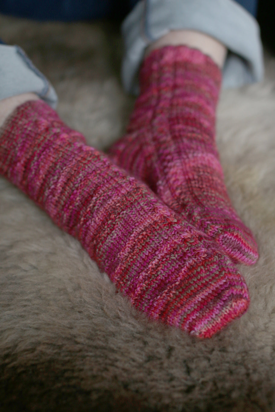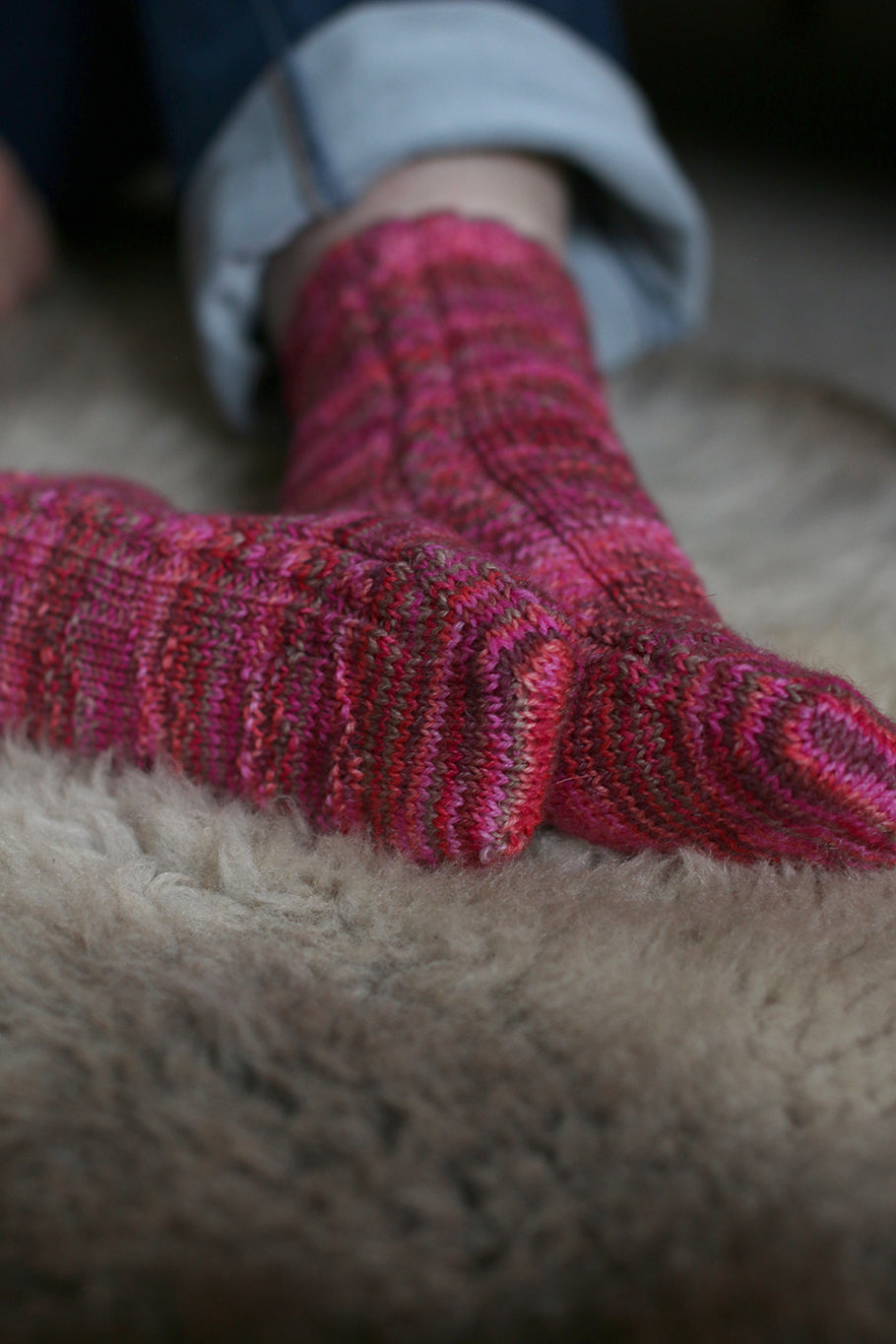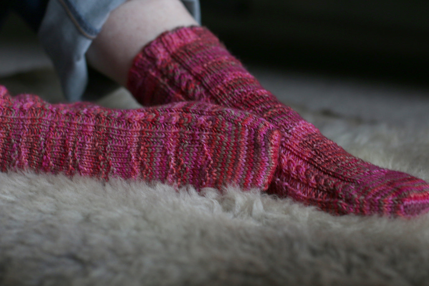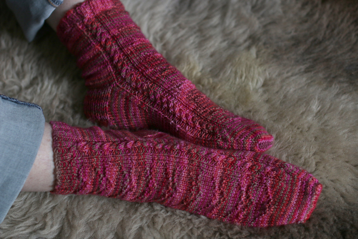 A one-off knitted sample from our Single Patterns, knitted with Susan Crawford Vintage Ghyll, in the shade Jo, an uplifting variegated colourway, of pinks, plums and taupes. These charming socks feature a textured heart surrounded by elegant cables which wind their way down the front panel of the socks.
