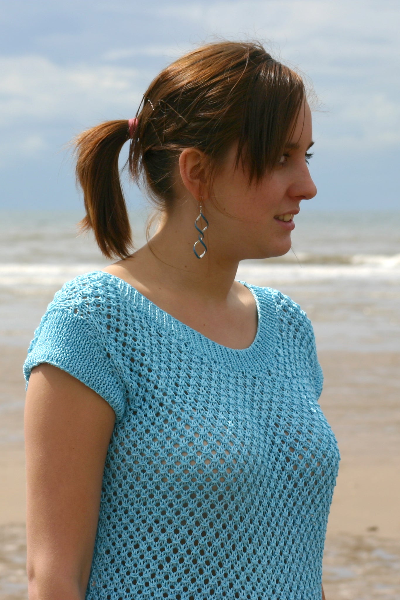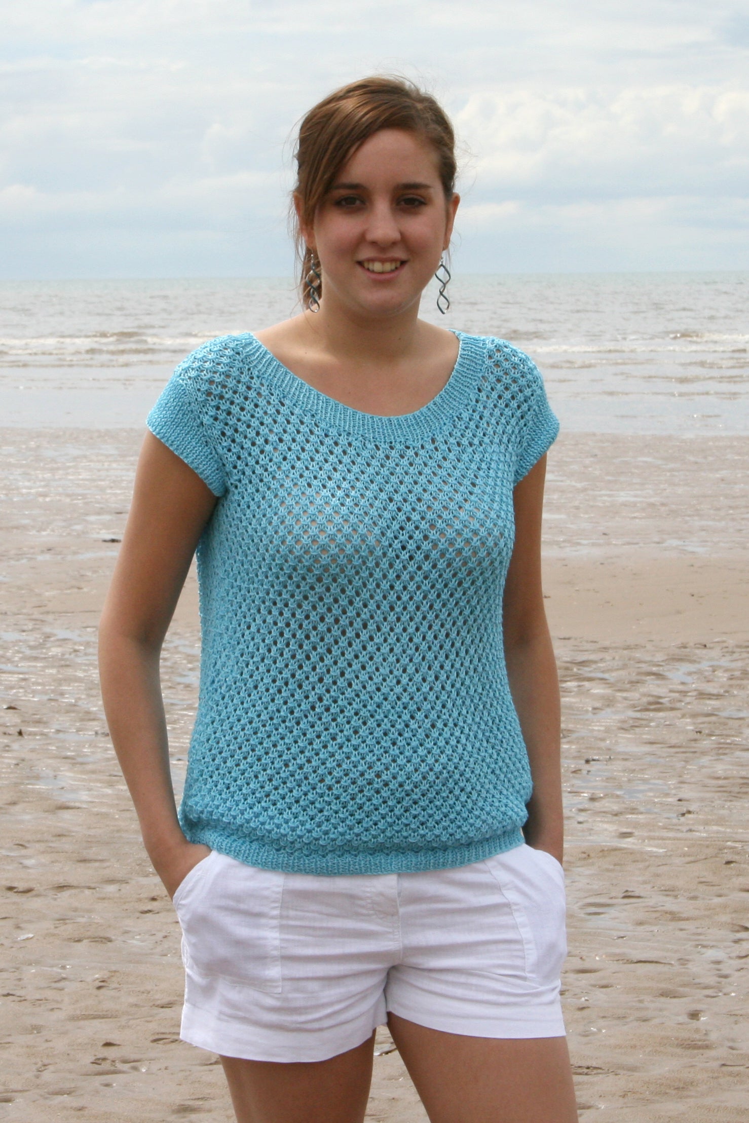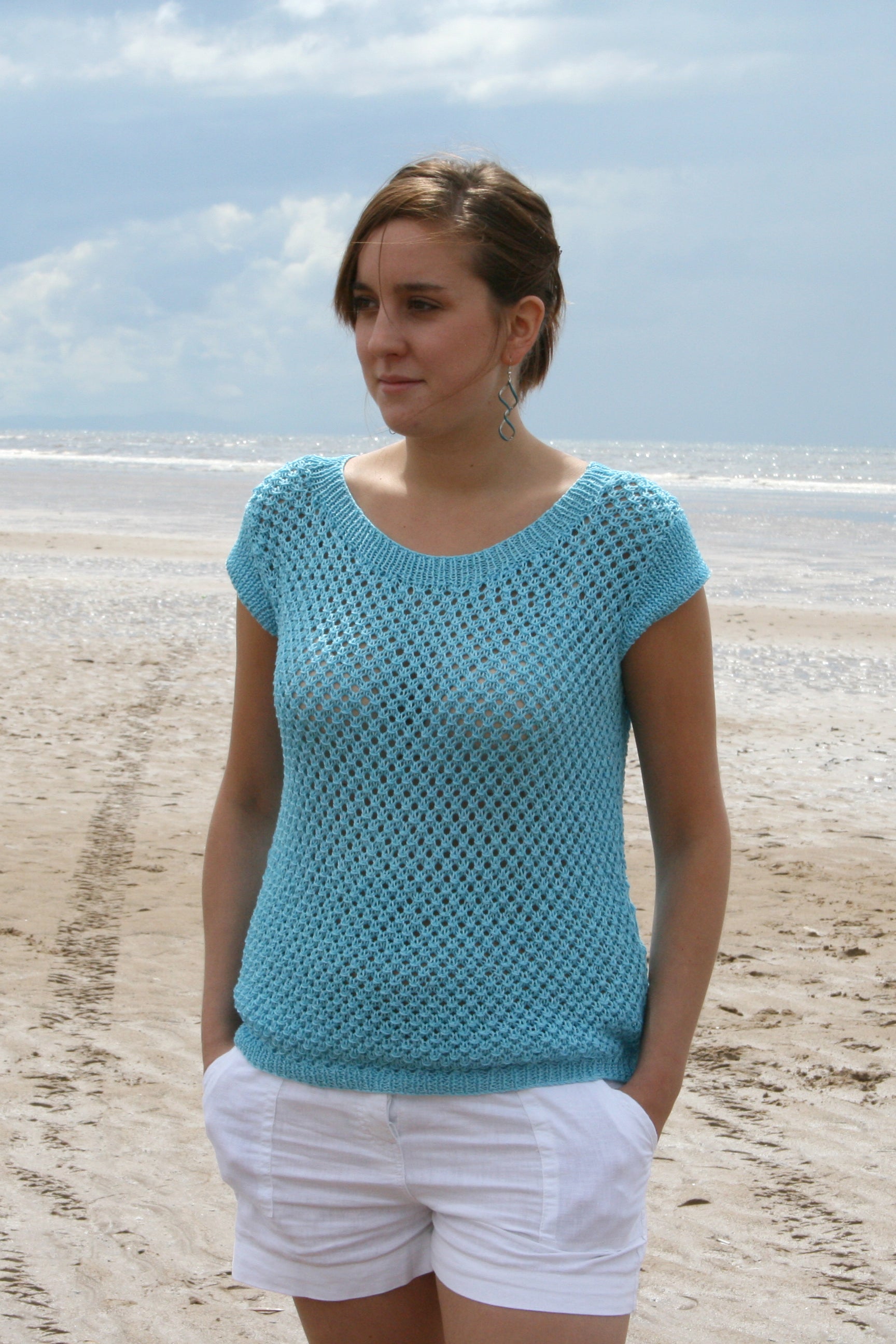 A one-off knitted sample of an original design by Susan Crawford knitted using a mercerised yarn in a summery shade of blue. This simple sweater features an all over open lace stitch with neat cap sleeves and a scooped round neck. Perfect for long summer days!