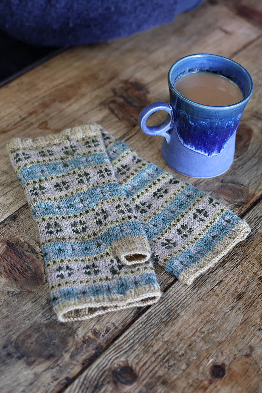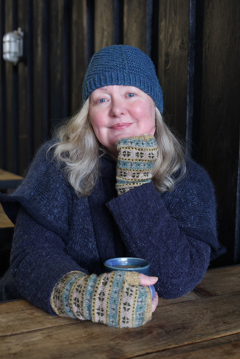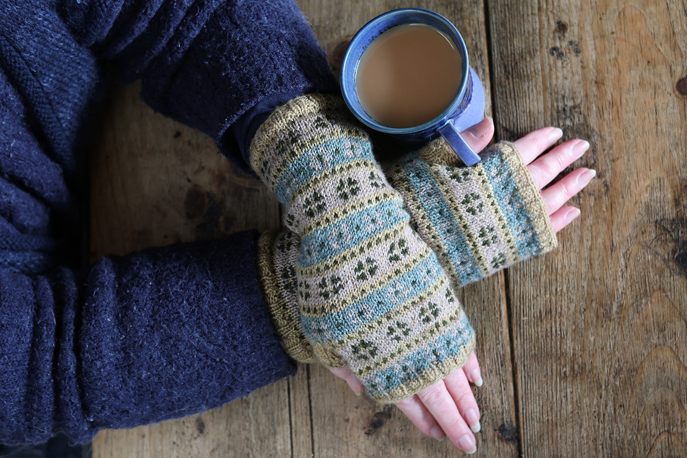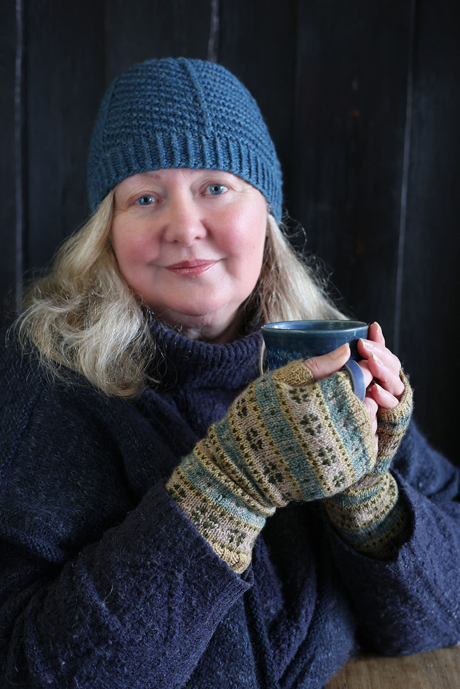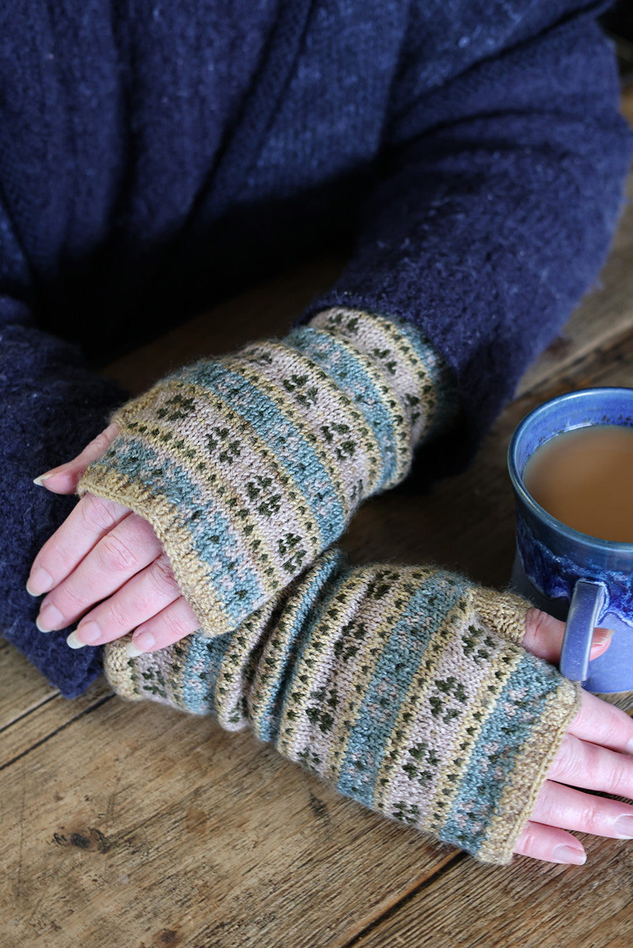 The Agatha mitts are knitted from the cuff in the round, using a repeating stranded colourwork motif, which is worked from a chart. Thumb stitches are placed on waste yarn whilst the upper hand section is worked. Finally, the thumb is knitted to finish. This simple pattern with a repeating motif is perfect for knitters new to colourwork or for a more experienced knitter who desires a simple knit to work on.