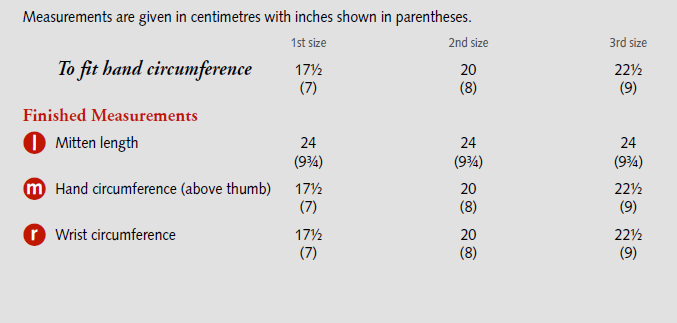 The pattern includes instructions for three sizes to fit hand circumference measurements between 17.5cm (7in) and 22.5cm (9in) and contains both clear written pattern directions, together with charted colour work instructions.