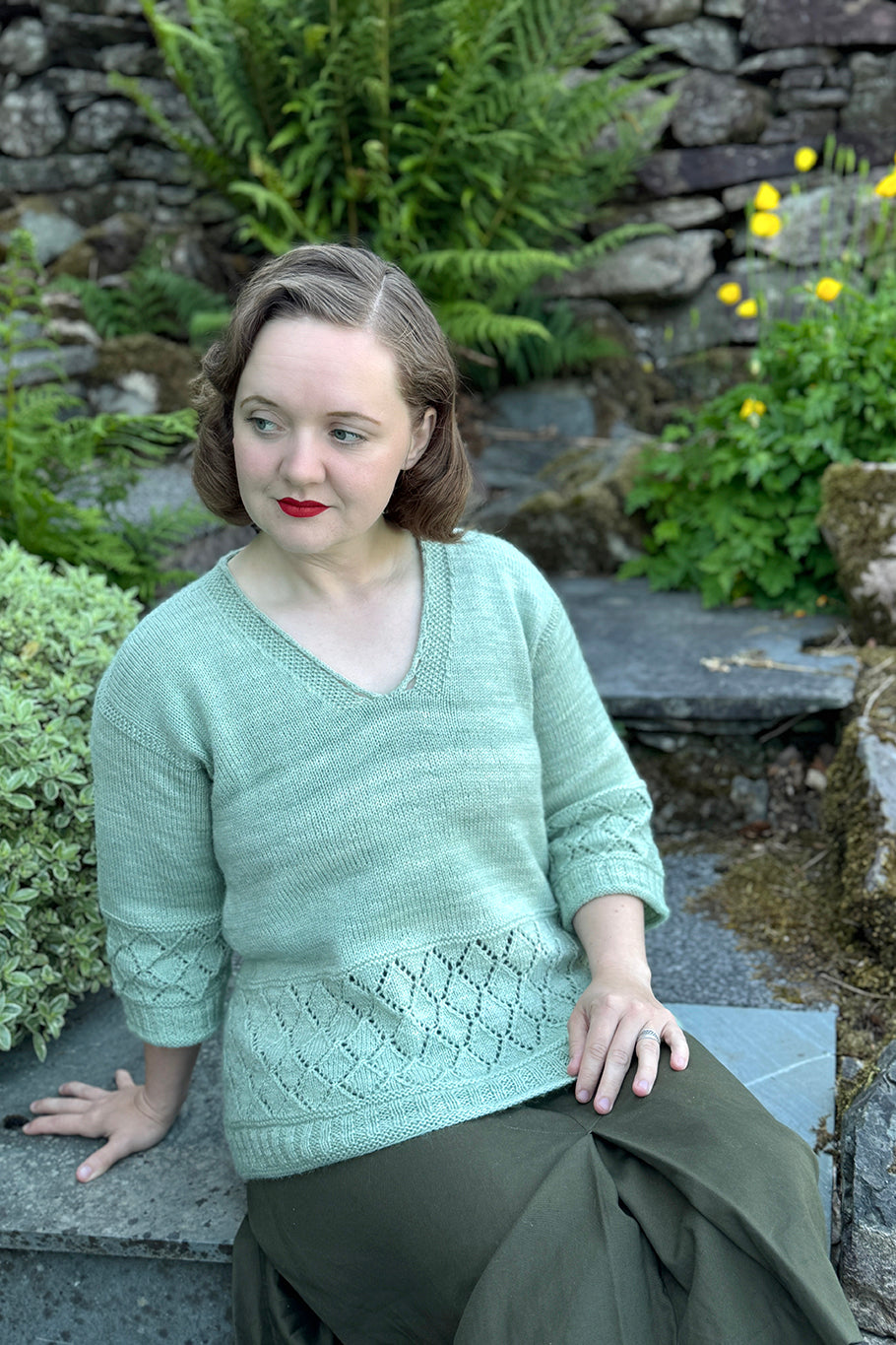 Jamieson is knitted using Susan Crawford Excelana North fingering weight a soft worsted spun pure wool, perfect for replicating this historic garment whilst being suitable for wearing next to the skin. We have shown our Jamieson samples in traditional undyed natural cream yarn – Alabaster and also in Nile Green – a perfect art deco inspired blue-green.