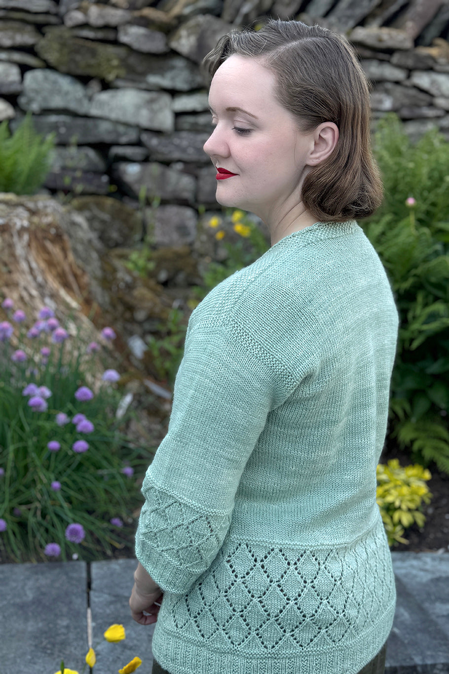 Jamieson is knitted in the round from the bottom up commencing with a decorative lacework section, before continuing in stocking stitch. Once the armholes are reached, the sweater is divided into front and back pieces and knitted back and forth. The shoulders are joined using the three-needle cast-off method and then the sleeves are picked up around the armhole and knitted downwards in the round. The neckline is knitted with an unusual i-cord edging that requires an additional DPN to be used and a second skein of yarn. A Moss (Seed) st panel is worked across the shoulders and a garter stitch edging alongside both armholes. The body and sleeves have false seams created by working a purl stitch at the seam points. A ballerina length sleeve as was typical of Spencers, finishes the look. All these added details provide real couture finishing touches to this beautiful piece.