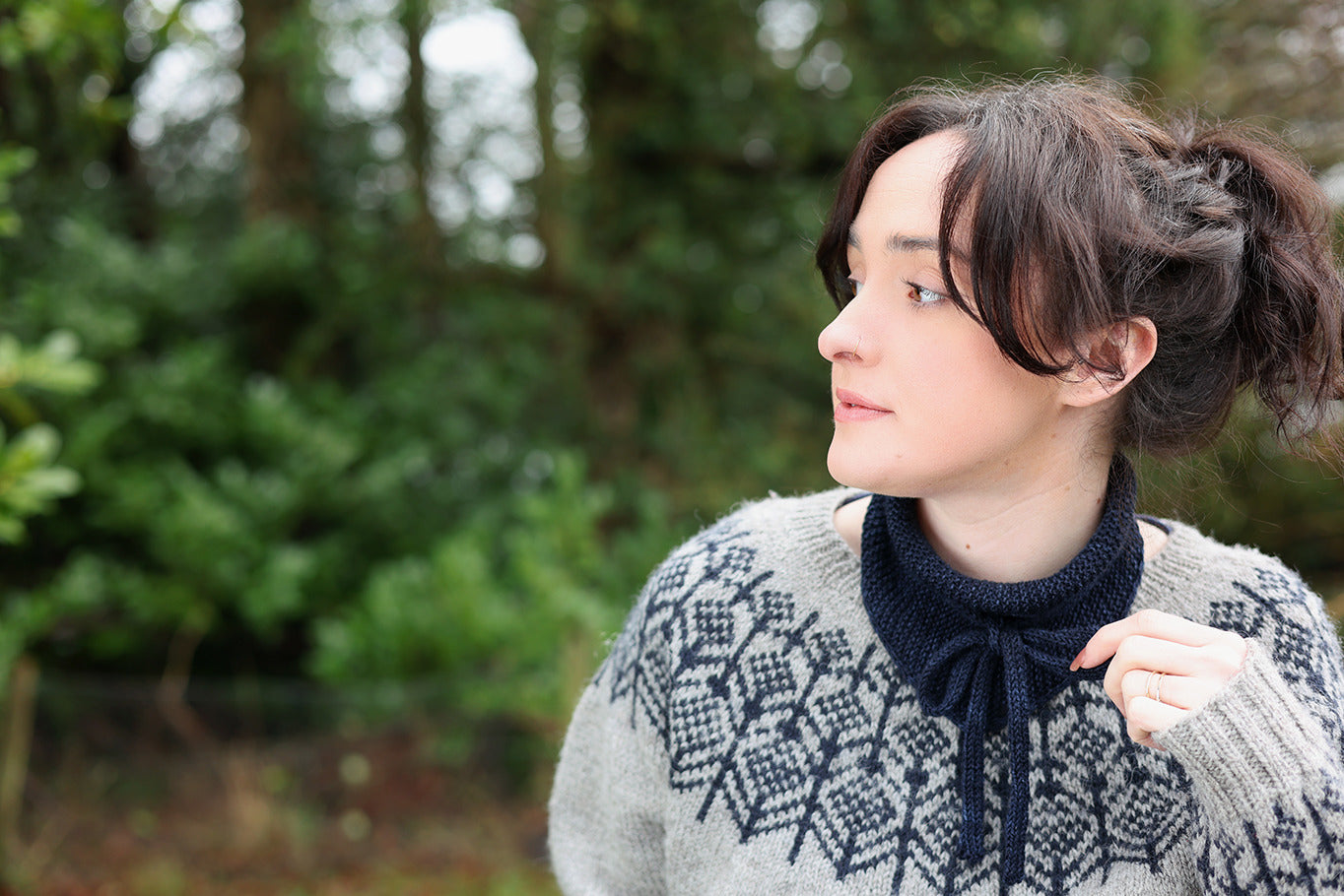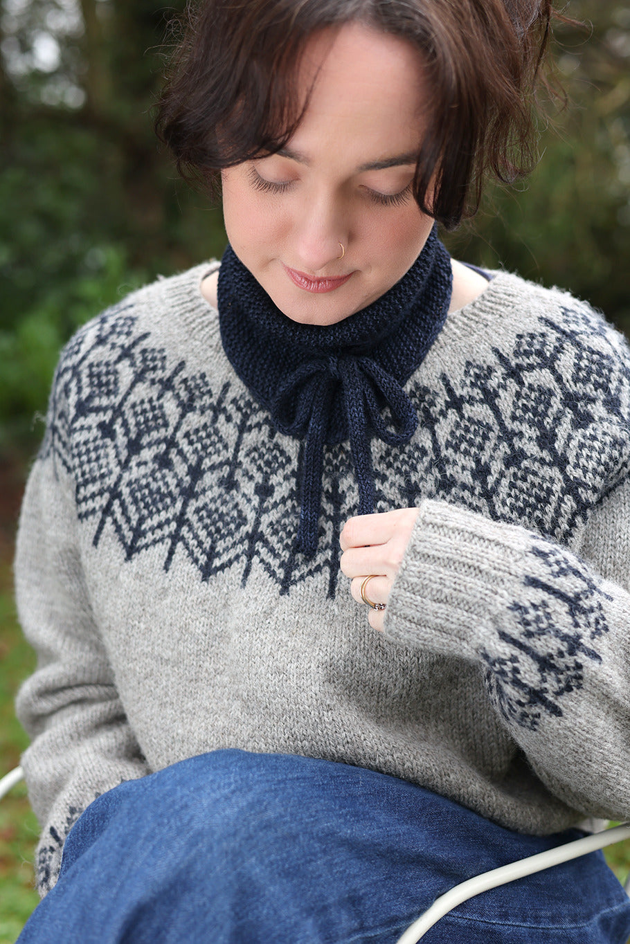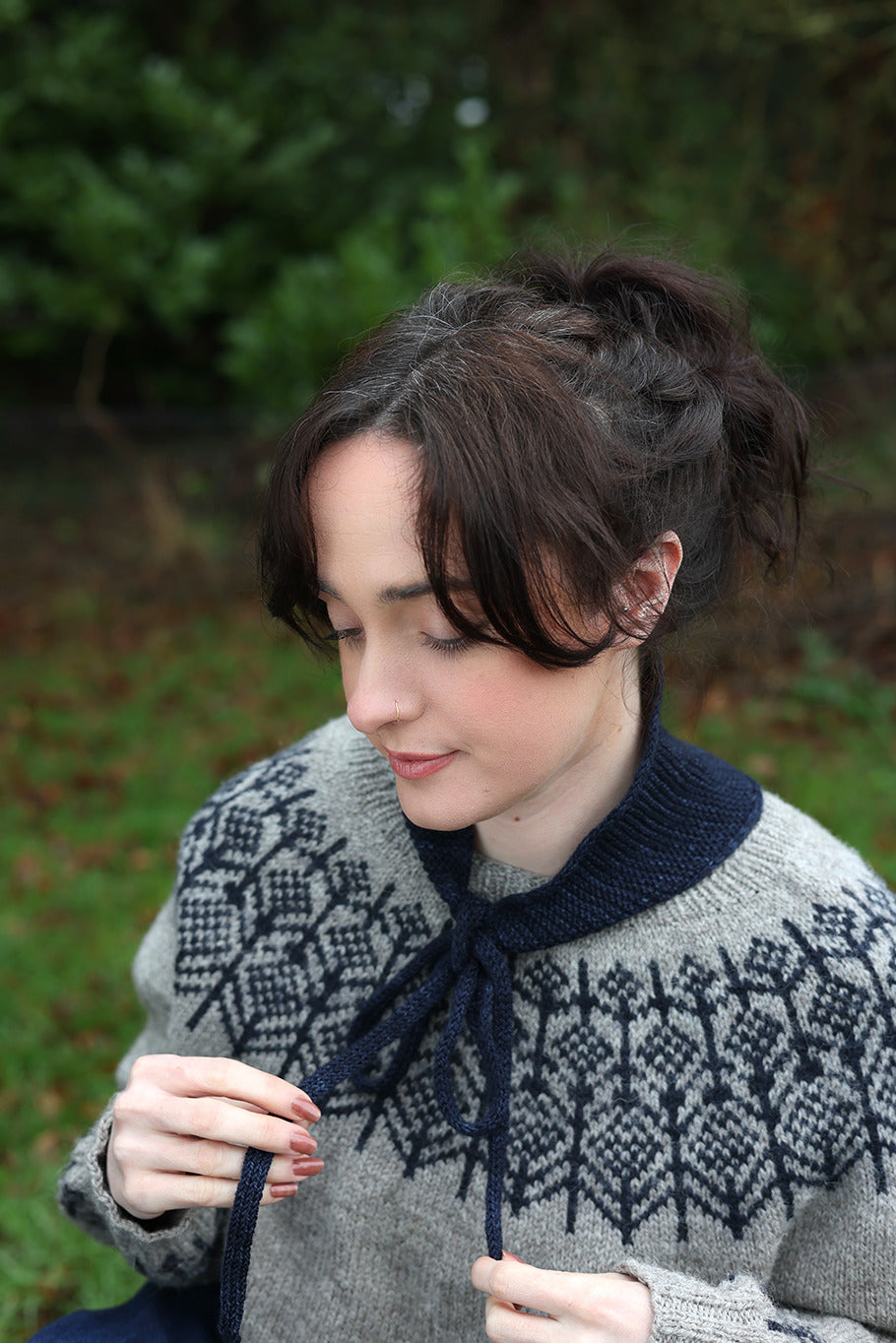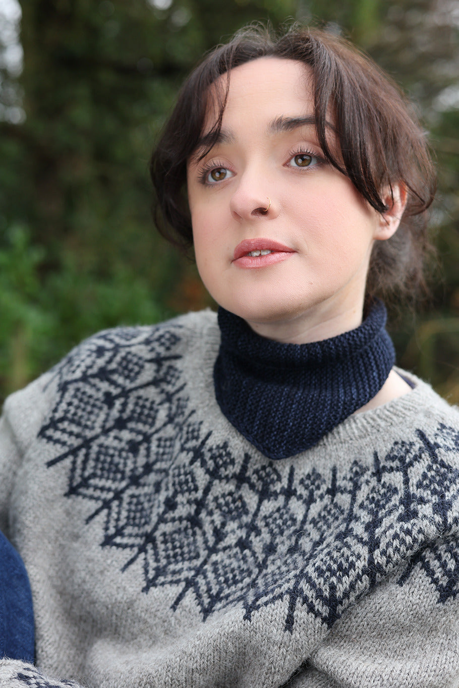 Piccina is knitted using Susan Crawford Bluem Sock a soft and resilient fingering weight 75% Blue Faced Leicester and 25% Nylon. Option two also uses Susan Crawford Mist. The yarns are dyed in-house by Susan and her team. Shown here in shade Lime Mortar but looks fabulous in any of Bluem's stunning colours.