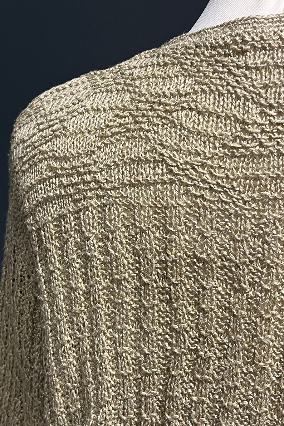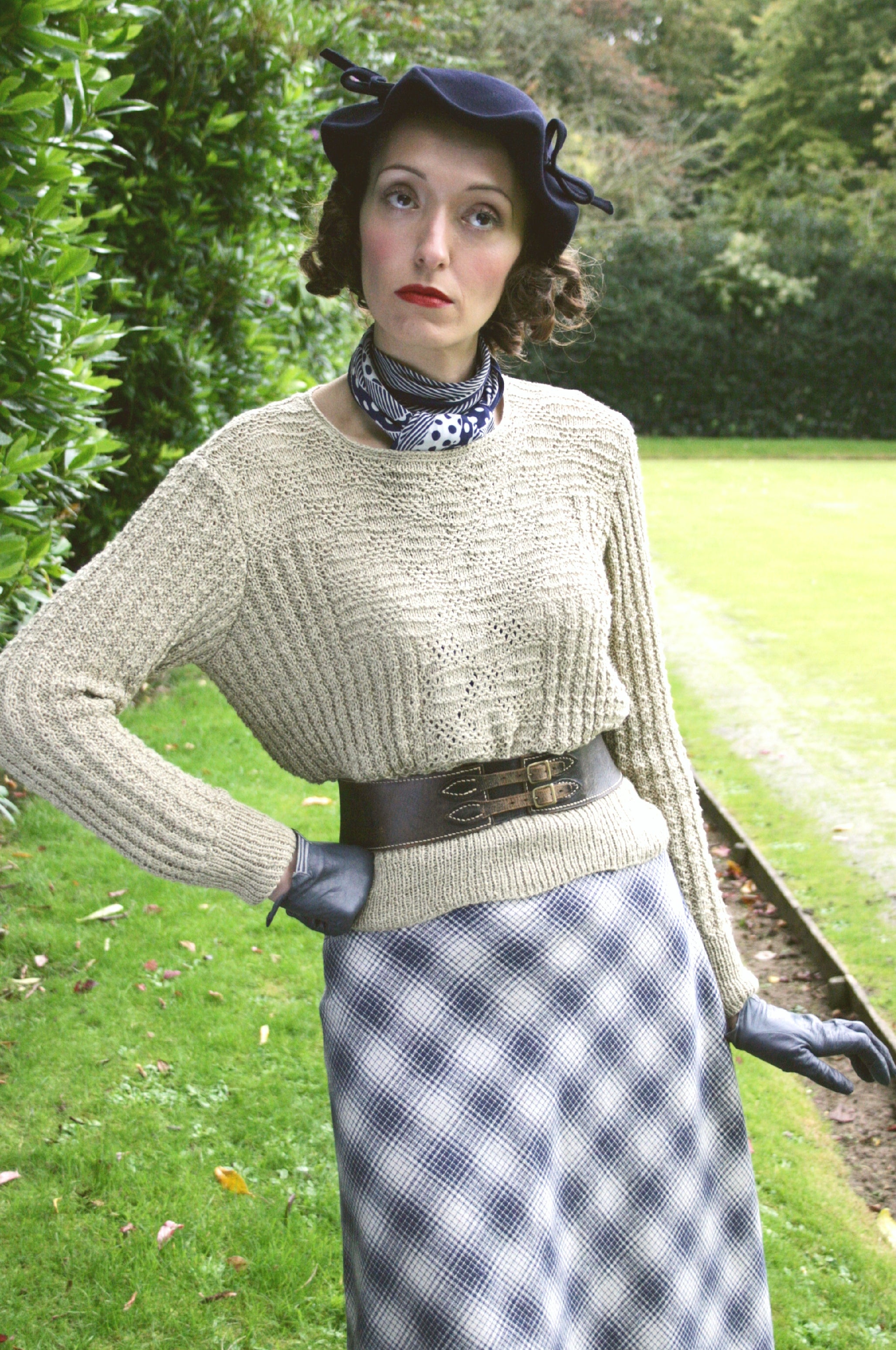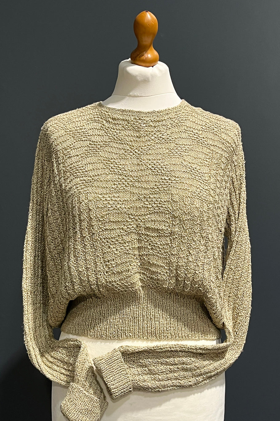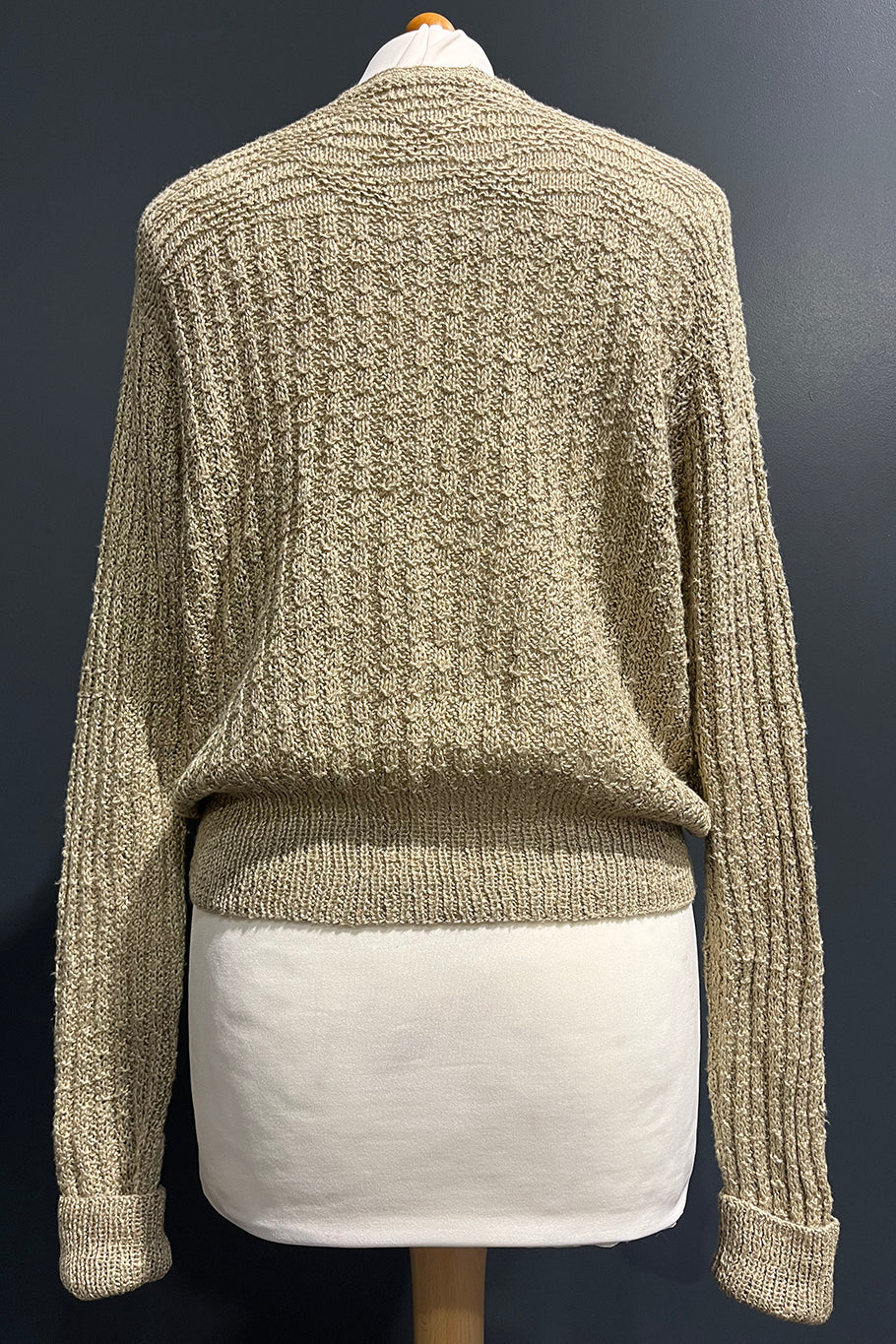 A one-off knitted sample from A Stitch in Time Volume 1 knitted using 100% silk from Habu Textiles in a beige shade from a vintage 1930s pattern. The sweater features a cabled pattern to the lower body and sleeves paired with an unusual textured patter to the centre front and front and back yokes. The sweater has long elegant sleeves, a simple shape and comfortable round neck.