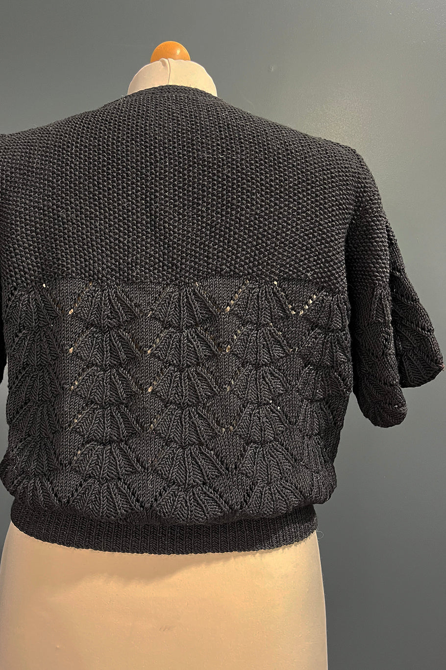 A one-off knitted sample using the 'Summery - and a New Pattern!' pattern from A Stitch in Time Volume 2 and knitted in a cashmere and merino blend in black. This softly blousoning sweater features a scalloped lace pattern set again a moss stitch yoke and a v-neck front. The scalloped pattern is repeated on the short sleeves creating a sophisticated and elegant silhouette.