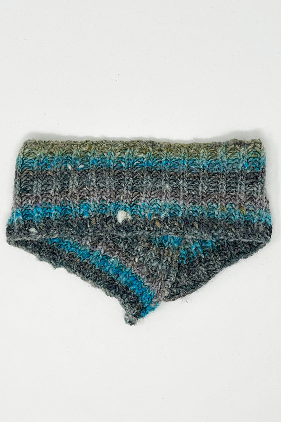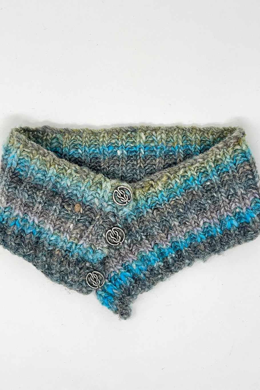 A one-off knitted sample of an original design by Susan Crawford knitted using a Noro silk yarn in blues, greys and brown. The tippet is very similar to a cowl but sits snuggly around the neck with shaped edges for a comfortable fit. Decorative metal buttons are added to close the tippet.